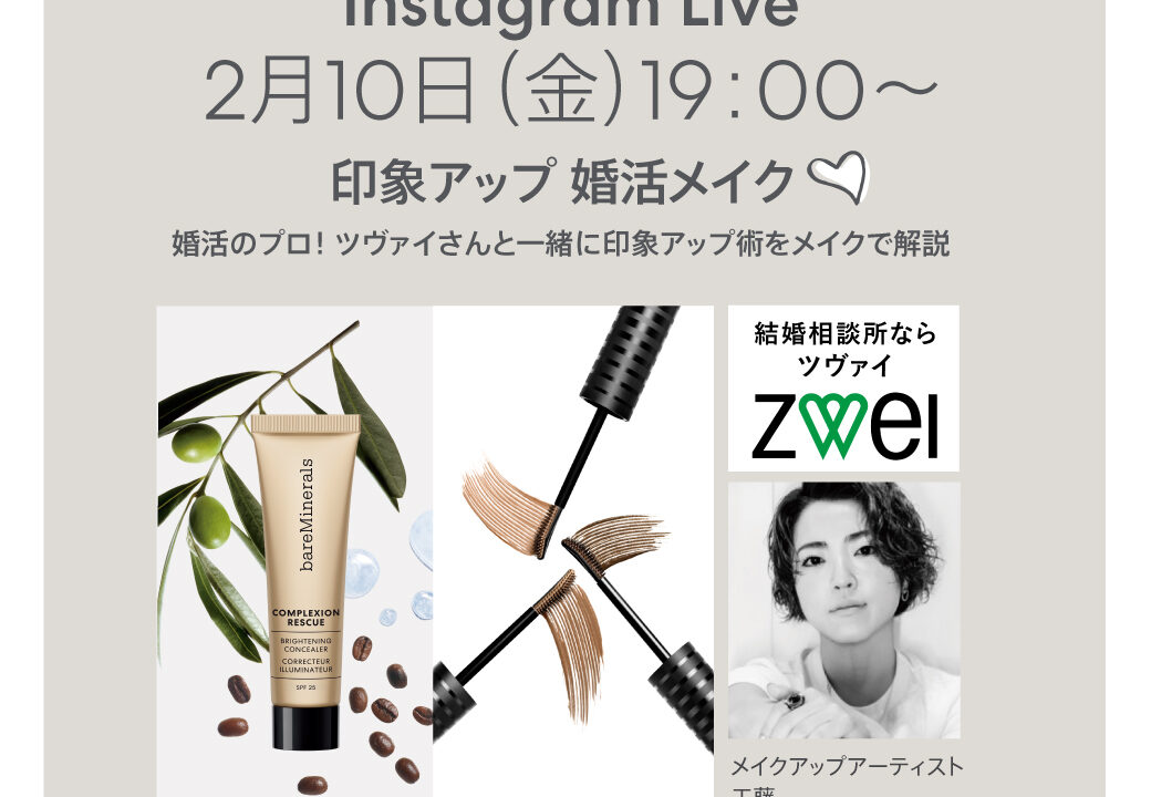 クリーンビューティーのリーディングブランド「ベアミネラル」を輸入販売するベアエッセンシャル株式会社(本社:東京都中央区、代表:菅野 沙織)は、2023年2月10日(金)、 業界最多となる全国50店舗の結婚相談所を運営する結婚相談所ツヴァイと「印象アップ!婚活メイク」のコラボインスタライブ配信が決定しましたのでお知らせいたします。