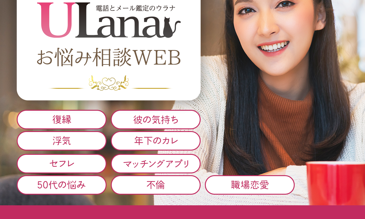 ◆株式会社エムティーアイが運営する『電話占いウラナ』は、お客様から投稿された様々な相談内容を占い師が回答した200以上の実話を「復縁」「彼の気持ち」「浮気」「セフレ」「職場恋愛」「年下のカレ」「不倫」「マッチングアプリ」「50代の悩み」にジャンル分けして、どなたでも手軽に閲覧できるWEBサイトを開設致しました。